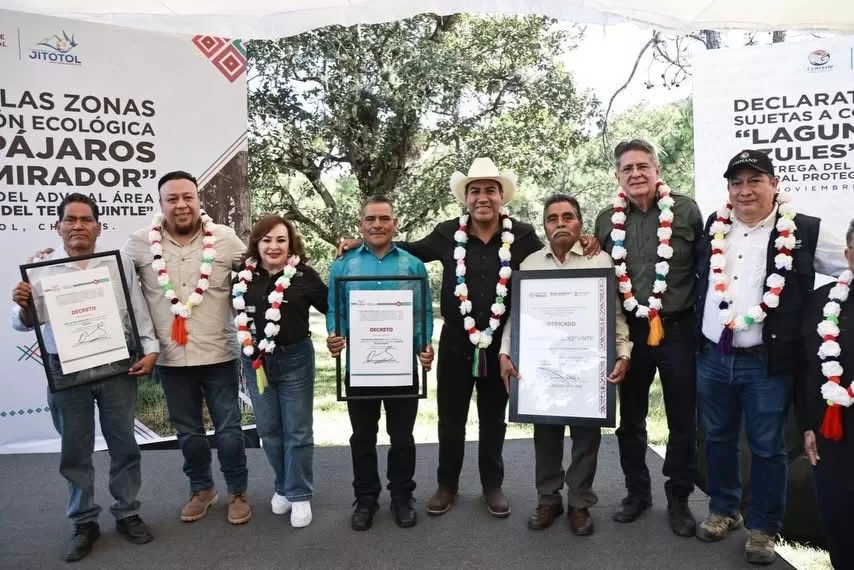 M de R / Diario de Chiapas El gobernador Eduardo Ramírez Aguilar encabezó la firma del Decreto de Declaratoria de Áreas Naturales Protegidas con la categoría de Zona Sujeta a Conservación Ecológica para los territorios Laguna de Pájaros Azules y El Mirador, y entregó el certificado de Área Destinada Voluntariamente a la Conservación (ADVC) del Área Natural Protegida La Cueva de Tepezcuintle, en el municipio de Jitotol. Ante habitantes, ejidatarios y representantes de sectores productivos, el mandatario remarcó que este acto ratifica el sentido humanista, la conciencia ambiental y la