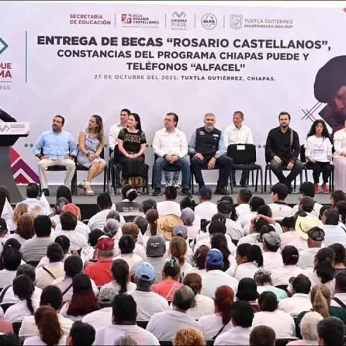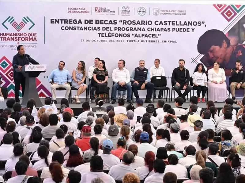 M de R / Diario de Chiapas Durante la entrega de becas de alfabetización Rosario Castellanos, constancias del programa Chiapas Puede y celulares Alfacel, el gobernador Eduardo Ramírez Aguilar destacó que uno de los propósitos del gobierno de la Nueva ERA es fortalecer la educación. Enfatizó que se trabaja en unidad para que más personas aprendan a leer y escribir, con la meta de alzar bandera blanca como símbolo de que Chiapas ha vencido en la lucha contra la ignorancia. “Cuando haya pasado este gobierno, recordaremos que hubo una época